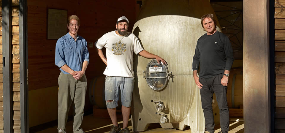 After the fermentation, the free-run wine is separated as it is aged part in oak barrels for a natural stabilization, and part in cement egg-shaped containers, using egg-white from organic laying hens as a natural clearing agent.